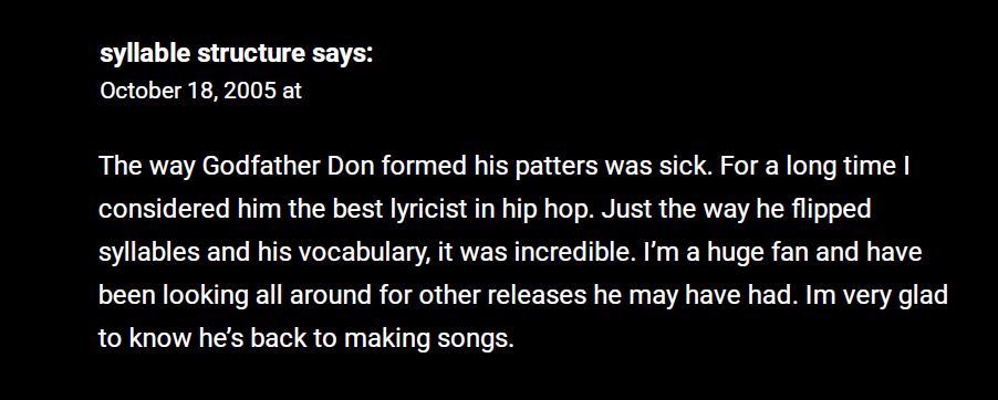 (Also take a moment to enjoy Kool Keith’s meandering recollections of Godfather Don’s lost years.)